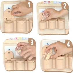 Im unteren Bereich befinden sich drei Holzbecher mit Kunststoffuntersetzern zum Verstecken von Gegenständen und zum Trainieren der Geruchserkennung. Kinder lernen, starke/schwache und angenehme/unangenehme Düfte zu unterscheiden, Dinge in solche zu sortieren, die gut riechen und die nicht gut riechen, sowie wie sie ihren Geruchssinn schützen. Die Tafel kann im Wandrahmen oder eigenständig auf Tisch oder Boden verwendet werden.
