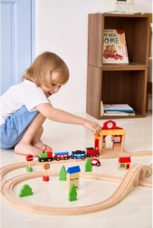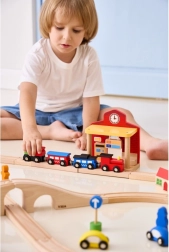 Der Bahnhof ist ideal für Kinderszenarien – vom Fahrkartenverkauf bis zu An- und Abfahrten der Züge. Die Abmessungen sind so gewählt, dass er auf die meisten Spielflächen passt und mit gängigen Holzschienen kompatibel ist. Das Spiel fördert Feinmotorik, Hand-Auge-Koordination und soziale Kompetenzen.