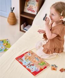 Die Puzzles zeigen bunte Tierfiguren, die verschiedene Musikinstrumente spielen.