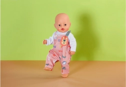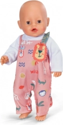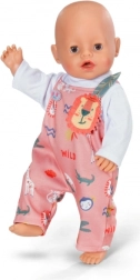 Der rosa Latz-Strampelanzug mit fröhlichen Tiermotiven und Löwen-Applikation regt die Fantasie an und verleiht jeder Puppe einen individuellen Stil.