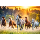 Das Motiv der galoppierenden Pferde auf einer grünen Wiese begeistert Natur- und Tierliebhaber und wird zum schönen Blickfang in Ihrem Interieur.