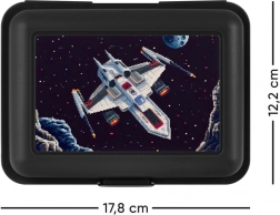 Die Plastikbox hat ein attraktives Design mit Raumschiff und Sternen, das alle anspricht.