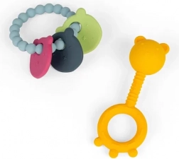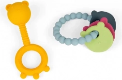 Dieses Set ist aus sicherem Lebensmittelsilikon gefertigt, das strapazierfähig und leicht ist, ideal für kleine Kinderhände. Die Spielzeuge haben strukturierte Oberflächen, die sensorische Reize bieten und helfen, den Griff und die Geschicklichkeit zu entwickeln. Zudem verstärkt sanfter Rasselklang diese Reize.