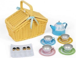 Dieses Picknick-Set enthält 18 Teile Geschirr, einschließlich Teekanne, Tassen, Teller und Löffel, die eine komplette Ausstattung für kleine Picknicker bieten.