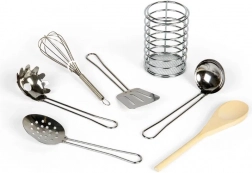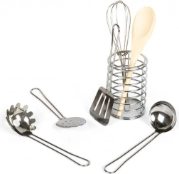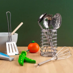 Das Set an Werkzeugen wird in einem praktischen zylindrischen Behälter aufbewahrt, was die Handhabung und Lagerung erleichtert. Kinder können wie echte Köche rühren, mischen und servieren, was ihre Feinmotorik und Hand-Auge-Koordination fördert. Hergestellt aus hochwertigen Materialien, sind die Utensilien auch sicher und ungiftig gefärbt.