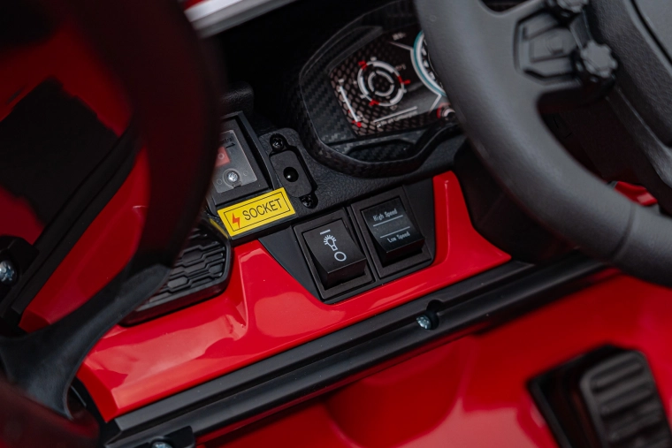 Der Innenraum überzeugt mit einer doppelsitzigen Bank aus Eco-Leder mit Sicherheitsgurten, realistischem Lenkrad, Pedalen und einem übersichtlichen Bedienpanel. Kinder werden die Audioausstattung lieben – FM-Radio, MP3, USB, AUX und Bluetooth, inklusive vorinstallierter Melodien und Hupe. Aufklappbare Scherentüren und voll funktionsfähige LED-Beleuchtung unterstreichen den Premium-Look.