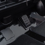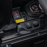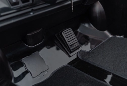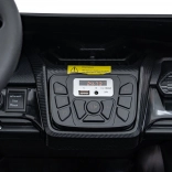 Zweisitzige Öko-Ledersitze mit Gurten, Sounds und Hupe am Lenkrad, FM-Radio, MP3, USB, AUX und Bluetooth. Ein Batteriestatus-Indikator informiert über den Ladezustand.