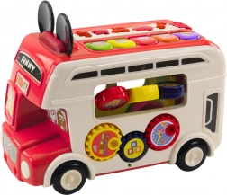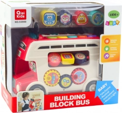 Der Bus ist mit Öffnungen für Buchstabenblöcke ausgestattet, die das Kind an die entsprechenden Stellen anpassen kann, wodurch es seine Beobachtungsfähigkeiten und Bewegungsgenauigkeit entwickelt. An den Seitenwänden befinden sich drehbare Mechanismen und interaktive Elemente, die zusätzliche sensorische Reize bieten und aktives Erforschen unterstützen.