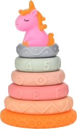 Dieses Set besteht aus sieben Elementen, einschließlich eines niedlichen Einhorns und sechs weichen Ringen, die beliebig gestapelt und angepasst werden können. Jeder Ring hat einzigartige Muster und Texturen, einschließlich Zahlen und Buchstaben, was den Tastsinn und das frühe Lernen durch Spielen fördert.