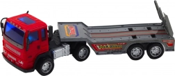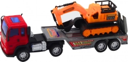 Der rote Lkw mit Plattformanhänger transportiert den Bagger sicher – Kinder üben Beladen, Entladen und den Transport wie auf einer echten Baustelle.