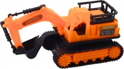 Der orangefarbene Bagger mit Ketten besitzt einen beweglichen Ausleger und eine Schaufel – so lässt sich Material leicht aufnehmen und umschütten.