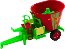 Der rot-grüne Futterwagen mit drehbarer Mischtrommel imitiert echte landwirtschaftliche Geräte und erweitert die Spielmöglichkeiten.