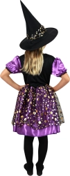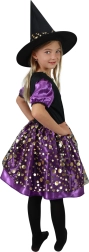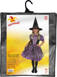 Gönnen Sie der kleinen Zauberin ein Outfit, in dem sie auf jeder Party strahlt. Das lila‑schwarze Kleid mit goldenen Punkten, gerafften Ärmelchen und auffälligem Rock sorgt für einen bezaubernden Look, der die Blicke auf sich zieht. Ebenfalls dabei ist ein abgestimmter Hut, der das Kostüm vervollständigt und sofort einsatzbereit macht.