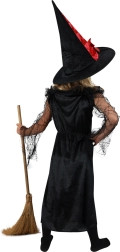 Gönnen Sie Ihrer Tochter einen magischen Look, der auf jeder Party auffällt. Das schwarz‑rote Kleid mit zarter Spinnennetz‑Spitze an den Ärmeln wird durch einen spitzen Hut mit Schleife ergänzt – zusammen entsteht ein authentisches Hexenkostüm für Kinder, in dem sie sich großartig fühlen wird.