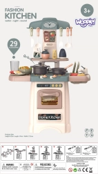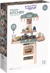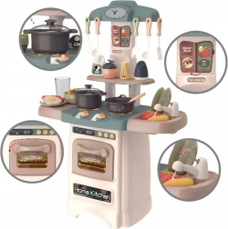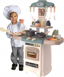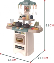 Diese moderne WOOPIE-Küche bietet Kindern ein realistisches Kocherlebnis. Dank der leuchtenden und tönenden Kochfelder wird Kochen zum spielerischen Vergnügen, während der funktionierende Wasserhahn mit echtem Wasser das Abwaschen wie in einer richtigen Küche ermöglicht. Nicht fehlen dürfen ein öffnender Backofen mit Display und Tasten, klassische Uhr, Spülbecken mit Abtropfgestell, Regale und Haken für Zubehör.