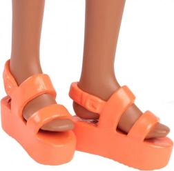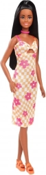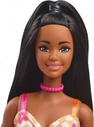 Wunderschöne große Barbie-Puppe mit langen, teilweise hochgesteckten schwarzen Haaren, verziert mit einem rosa Choker und orangefarbenen Plateausandalen. Ihr Look wird durch ein elegantes Kleid mit Blumenmuster abgerundet.