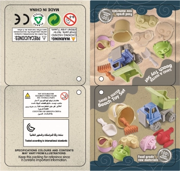 - Eimer, 2 Schaufeln, Sieb, Rechen, 2 Förmchen