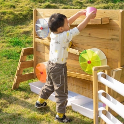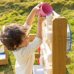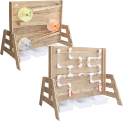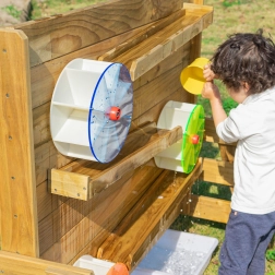 Die Holzkonstruktion aus imprägniertem Holz ist witterungsbeständig und mit einer ungiftigen Beschichtung behandelt. Perfekt als Ergänzung für Sandkästen und Außenspielplätze – bietet endlosen Spielspaß und zugleich eine sichere Umgebung für Experimente mit Wasserfluss und dem In-Bewegung-Setzen von Rädern.