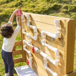 Diese zweiseitige Wand kombiniert sensorisches Wasserspiel mit STEM-Lernen. Eine Seite bietet bunte Wasserräder und Rinnen zur Beobachtung des Wasserflusses und von Ursache-Wirkungs-Zusammenhängen, die andere Seite bringt ein Netz aus transparenten und weißen Rohren mit Ventilen zur Steuerung der Durchflussmenge. Kinder trainieren Feinmotorik, logisches Denken und Zusammenarbeit.
