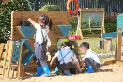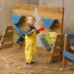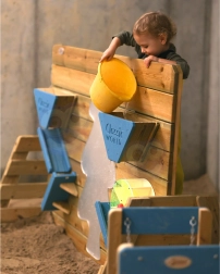 Zwei Trichter, transparente Kanäle und ein Mühlrad verwandeln Wasser oder Sand in ein faszinierendes Spektakel. Kinder beobachten den Fluss, experimentieren und lernen die Prinzipien von Schwerkraft und Strömung kennen.