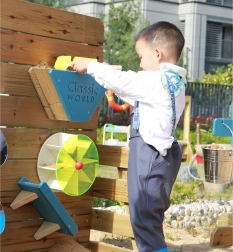 Dieses Holzspiel fördert Feinmotorik, logisches Denken und Kreativität. Kinder können Sand schütten oder Wasser in die Trichter gießen, beobachten, wie die Strömung das Mühlrad antreibt und über die Rinnen hinabfließt, und so Ursachen- und Wirkungsprinzipien entdecken. In der Mitte sorgt eine spiegelnde Folie in Baumform für zusätzliche Sinnesreize.
