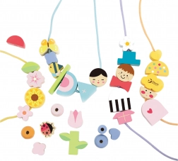 Verschiedene Perlen in Form von Blumen, Tieren und geometrischen Figuren motivieren Kinder zum Auffädeln, Sortieren und Gestalten eigener Muster.