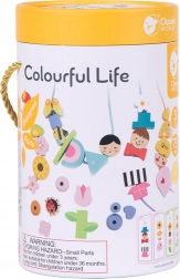 Hochwertige Holzteile mit ungiftigen Farben werden in einer praktischen Dose mit Deckel aufbewahrt – ideal zum Verstauen und Mitnehmen.