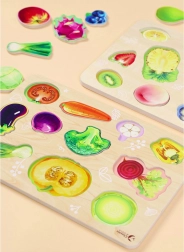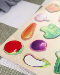 Jedes Teil stellt eine andere Gemüsesorte dar und trainiert das Erkennen von Formen, Farben sowie den Wortschatz.