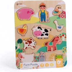 Dank der robusten Holzkonstruktion und glatten Kanten ist das Puzzle sicher und angenehm zu greifen. 12 Teile bieten genau die richtige Herausforderung für Kleinkinder und sorgen für langanhaltenden Spielspaß. Die farbenfrohe Platte mit malerischem Bauernhof lädt zum Spielen ein und fördert Fantasie und Wortschatz.