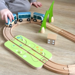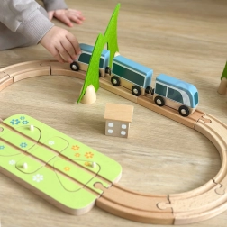Die Teile lassen sich kreativ kombinieren – Holzbausteine können aufeinander gestapelt werden, um Häuschen entlang der Schienen zu bauen. Hochwertige Naturmaterialien (Holz mit FSC-Zertifizierung, Filz aus recyceltem P.E.T.) sind langlebig, angenehm in der Haptik und ressourcenschonend. Ideal für das selbstständige Spiel und das gemeinsame Entdecken.