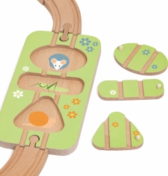 Das Formpuzzle lässt sich mit den Schienen verbinden. Kinder suchen die passenden Teile nach Tieren und Blumen und trainieren Logik sowie Geduld.