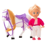 Lieferumfang: Mini-Puppe im Reitoutfit, weißes Pferd mit langer Mähne und Schweif, lila Sattel und Zaumzeug, Reitgerte.