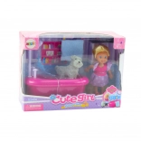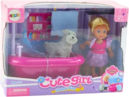 Die Puppe trägt ein hübsches rosafarbenes Kleid, und ihre beweglichen Arme und Beine ermöglichen vielfältige Positionen beim Spielen. Das weiße Hündchen mit weicher Textur wirkt realistisch und macht das Baden noch spannender.