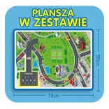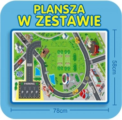 Im Set enthalten sind 3 Feuerwehrautos, Verkehrszeichen und eine Straßenmatte mit markierter Einsatzroute.