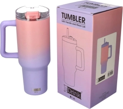 Entdecken Sie den Komfort eines großvolumigen Thermobechers, der modernes Aussehen mit praktischen Details vereint. Der pastellige Farbverlauf von Rosa zu Lila fällt sofort ins Auge, der transparente Deckel mit Öffnung für den Strohhalm und der bequeme Henkel erleichtern die tägliche Nutzung zu Hause und unterwegs.