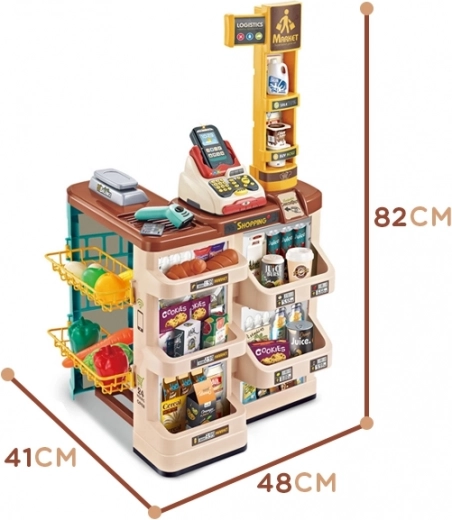 Zum Lieferumfang gehören außerdem ein Einkaufswagen/Korb für das Spiel zu zweit, Papiergeld, eine Zahlungskarte und verschiedene Lebensmittel (Obst, Gemüse, Getränke, Milchprodukte u. a.). Das ästhetische Design passt in jedes Interieur und die bunte Geschenkverpackung sorgt bei jeder Gelegenheit für Freude.