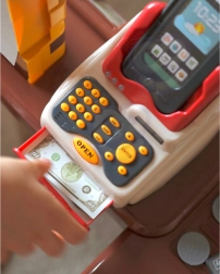 Die Kasse mit ausziehbarer Geldlade, Kartenleser und einem Scanner, der leuchtet und Töne abspielt, vermittelt Kindern ein authentisches Einkaufserlebnis.