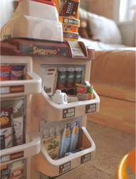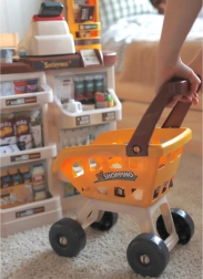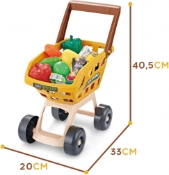 Inbegriffen sind ein Korb/Wagen und zahlreiche Lebensmittel wie Obst, Gemüse, Milch oder Saft – alles für ein vollwertiges Kaufladenspiel.