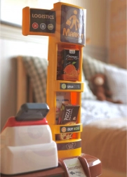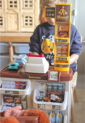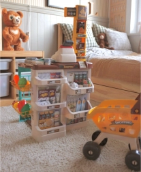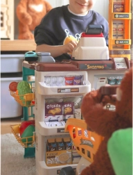 Die mechanische Waage imitiert das Original täuschend echt, und die Regalordnung mit Preisschildern hilft Kindern beim Sortieren, Einräumen und beim Erlernen von Werten.