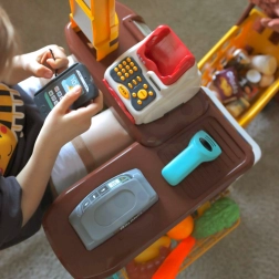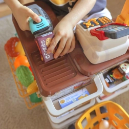 Mit dem Woopie Supermarkt-Set entdecken Kinder die Welt des Einkaufens und die Grundlagen des Zählens. Realistische Elemente wie der leuchtende und tönende Scanner, die Kasse mit ausziehbarer Geldlade und die mechanische Waage bilden einen echten Laden nach. Der stabile Tresen mit Hänge- und Regalfächern für Waren und übersichtlichen Preisschildern fördert Selbstständigkeit und Organisation.