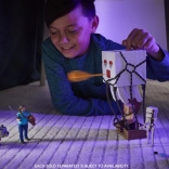 Erlebe das Minecraft-Filmabenteuer live. Der interaktive Ghast ist mit einer Taste auf der Oberseite ausgestattet, die Lichter, Soundeffekte aktiviert und ein oranges Projektil aus dem Maul abfeuert. Dank der Ketten und des hängenden „Käfigs“ kannst du Szenen nachspielen, in denen Piglins Ghasts für Angriffe einsetzen.