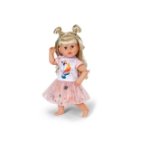 Gönnen Sie Ihrer Puppe einen magischen Look mit den einzigartigen Tutu-Kleidchen im Einhorn-Design. Das Set besteht aus einem weißen T-Shirt mit kurzen Ärmeln und verspieltem Einhorn-Print, kombiniert mit einem rosa Tutu-Rock aus Tüll mit echten bunten Pompons unter der oberen Schicht. Die Kombination aus sanften Materialien und elastischem Bund erleichtert das Anziehen und ist beim Spielen bequem.