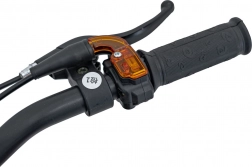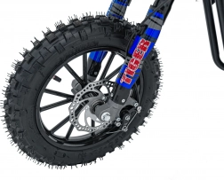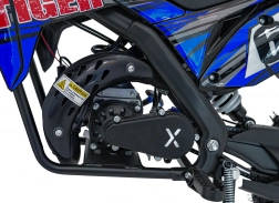 Das Mini-Bike TIGER mit 49-ccm-Motor ist eine ausgezeichnete Wahl für Freizeitfahrten in leichtem Gelände. Es bietet eine robuste Konstruktion mit pulverbeschichtetem Rahmen, verstärkter Schwinge und flexiblem Kunststoffverkleidungssatz. Der luftgekühlte Zweitakt-Einzylinder überträgt die Leistung per Kette auf das Hinterrad, während Scheibenbremsen für sicheres Anhalten sorgen.