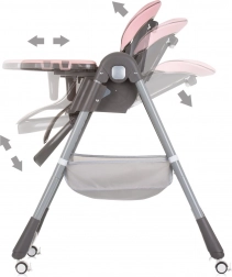 Bis zu 7 Sitzhöhen, 4 Rückenlehnen-Positionen und 2 Positionen der Fußstütze sorgen für Komfort beim Essen und Ausruhen. Der Sitz aus ECO-Leder ist weich und leicht abwischbar.