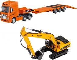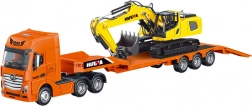 Das Set enthält einen Sattelzug mit Tiefladeranhänger und Bagger, was mehr Spielmöglichkeiten und eine realistische Simulation des Transports schwerer Maschinen ermöglicht. Der Lastwagen hat bewegliche Teile und die Auffahrrampe kann zum Be- und Entladen des Fahrzeugs auf eine Weise abgesenkt werden, die der tatsächlichen Transportarbeit entspricht.