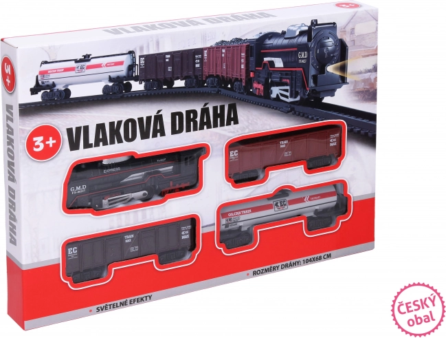 Batteriebetriebener Kunststoff-Spielzeugzug mit Licht und Sound. Lokomotive, 3 Waggons und runde Schienen 104 × 68 cm. Geeignet ab 3 Jahren, einfache Montage.