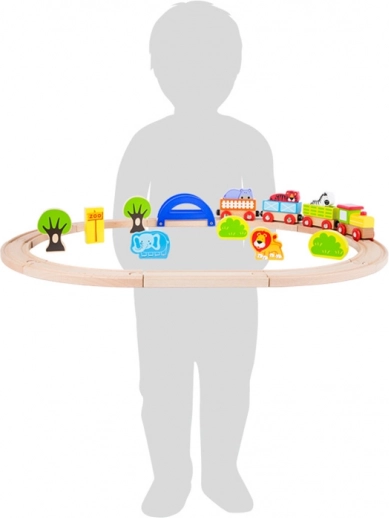 Ovales Gleis, Brücke, Bäume, Büsche, ZOO-Schild und Tierfiguren – alles in einer Packung für fantasievolles Spielen.