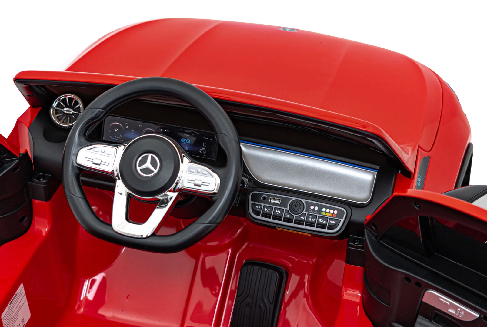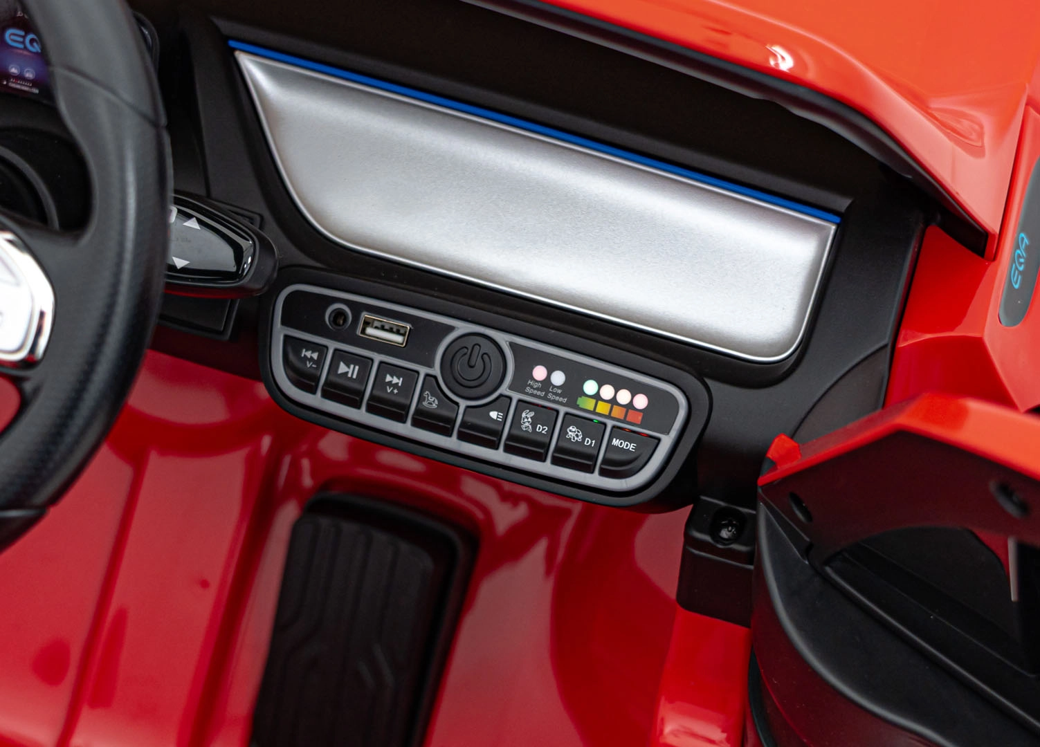 Das interaktive Panel mit Bluetooth, USB, MP3/AUX, voreingestellten Melodien und einer Hupe am Lenkrad begleitet jede Ausfahrt mit Lieblingsmusik. Den realistischen Look runden LED‑Front‑ und Rücklichter, ein detailliertes Interieur und öffnende Türen für leichtes Einsteigen ab.