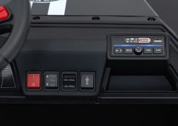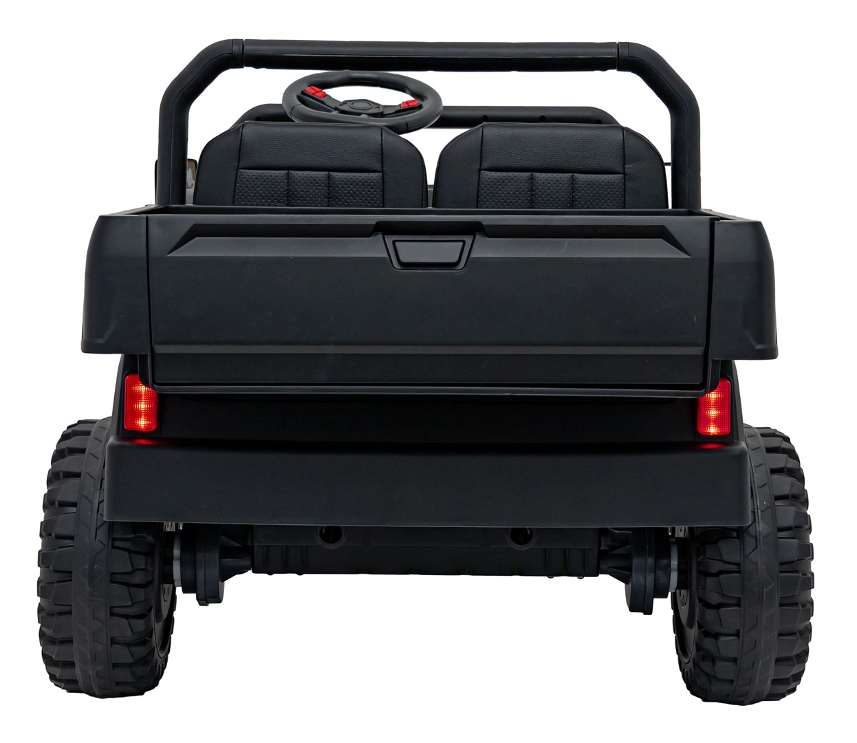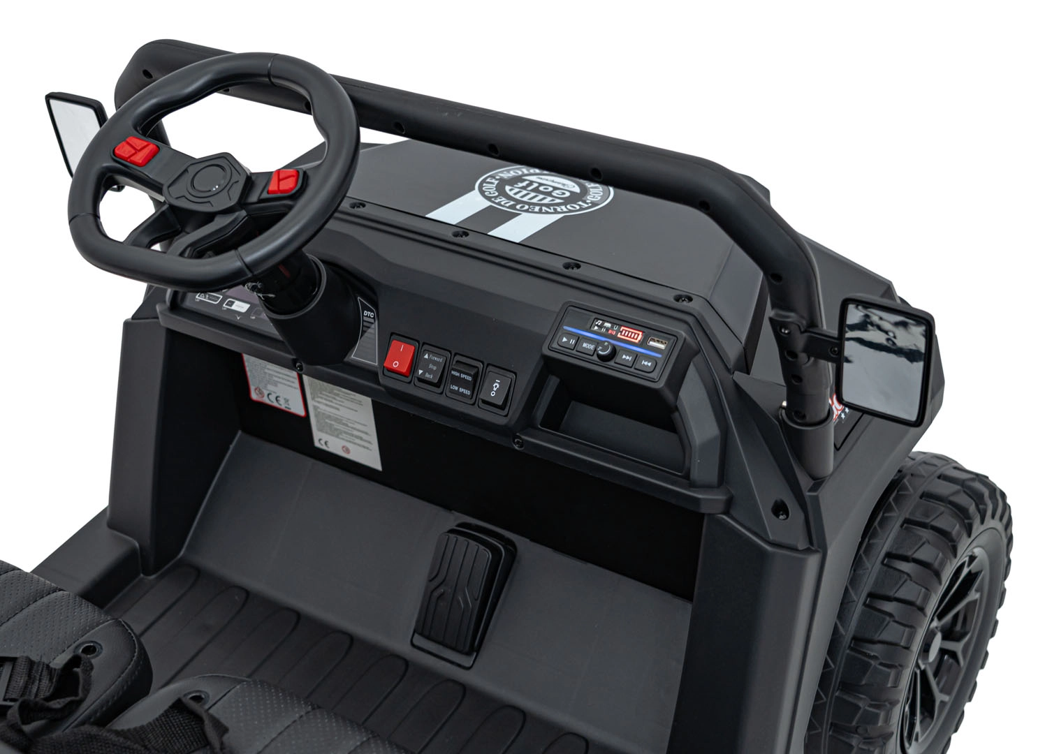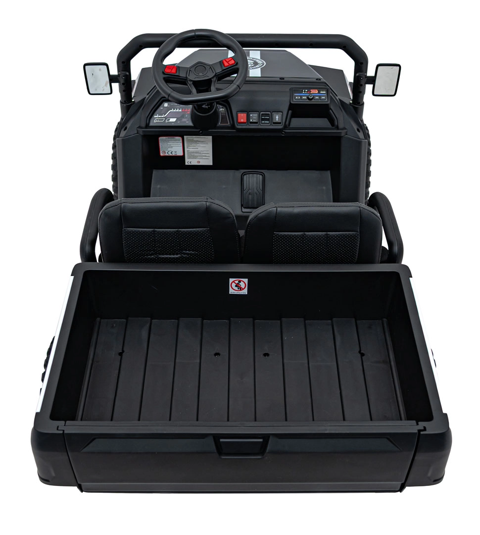 Das Interieur begeistert mit zwei separaten Sitzen aus Kunstleder mit Sicherheitsgurten, einem funktionsreichen Audio-Panel (FM-Radio, MP3, Bluetooth, USB) und Bedienelementen am Lenkrad. Für zusätzliche Sicherheit der Eltern steht eine 2,4-GHz-Fernbedienung mit drei Geschwindigkeiten und einer sofortigen STOP-Taste zur Verfügung. Der große hintere Kofferraum mit klappbarer Heckklappe nimmt alles Nötige für eure Ausflüge mit.