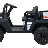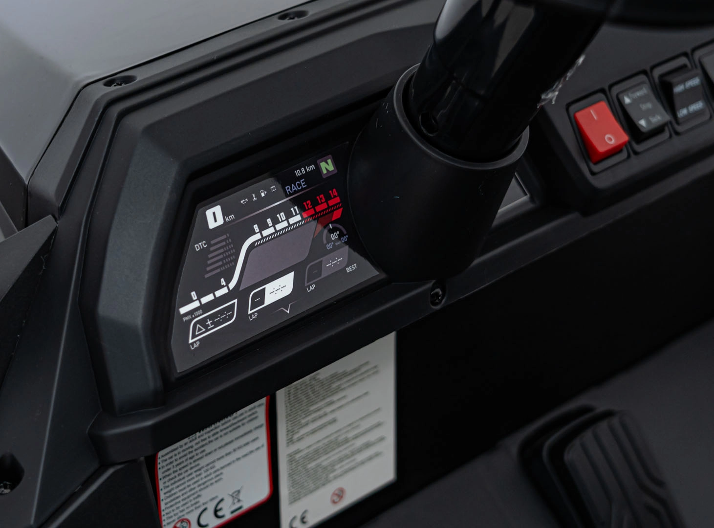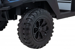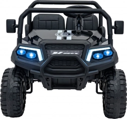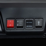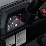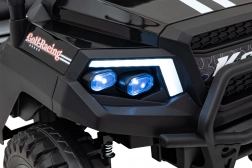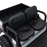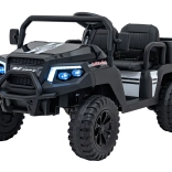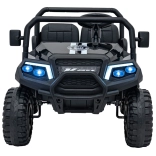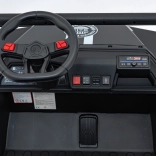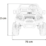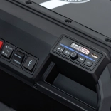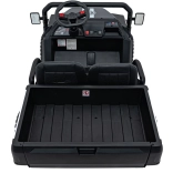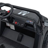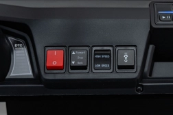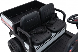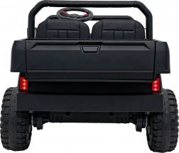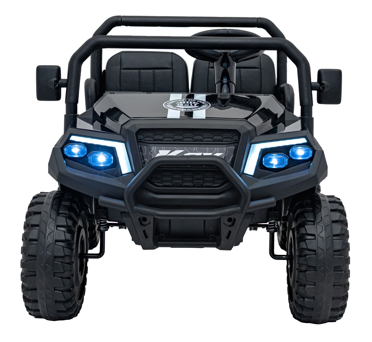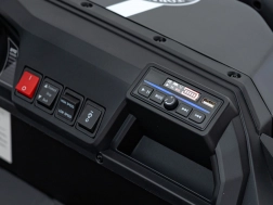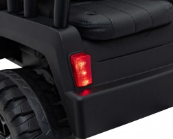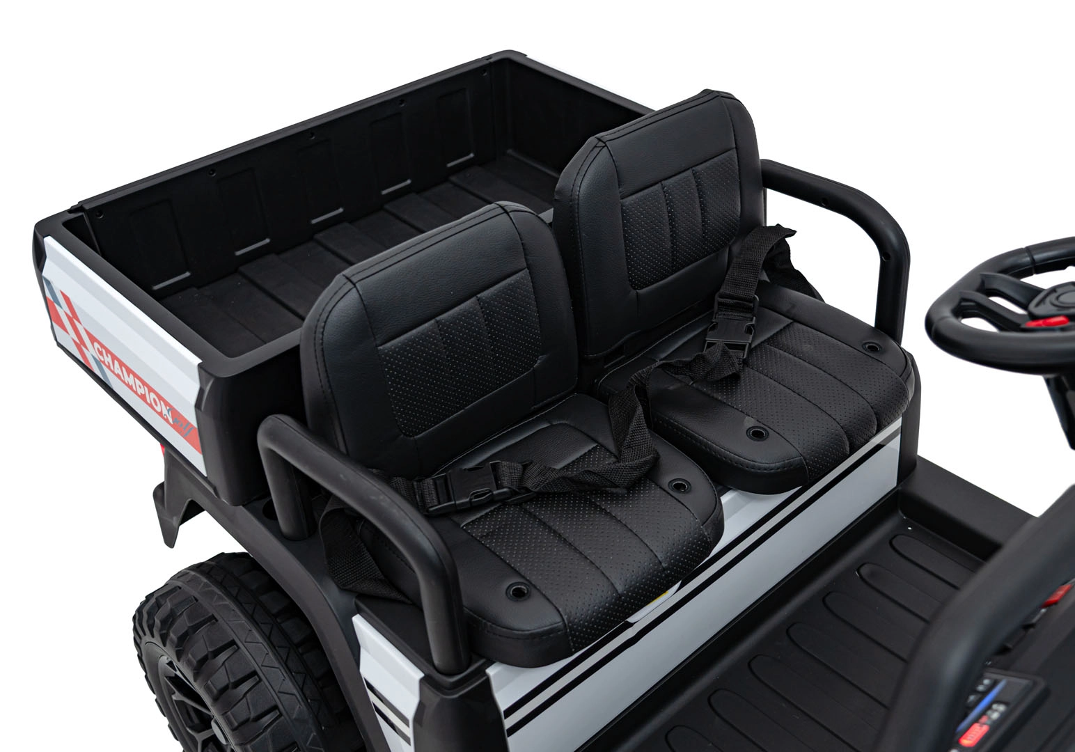Das Interieur begeistert mit zwei separaten Sitzen aus Kunstleder mit Sicherheitsgurten, einem funktionsreichen Audio-Panel (FM-Radio, MP3, Bluetooth, USB) und Bedienelementen am Lenkrad. Für zusätzliche Sicherheit der Eltern steht eine 2,4-GHz-Fernbedienung mit drei Geschwindigkeiten und einer sofortigen STOP-Taste zur Verfügung. Der große hintere Kofferraum mit klappbarer Heckklappe nimmt alles Nötige für eure Ausflüge mit.